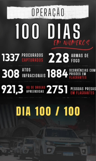 Afirma, ainda, a nota que, graças à dedicação incansável do efetivo das unidades operacionais, os resultados obtidos superaram expectativas e evidenciaram a efetividade das ações planejadas, sendo eles: pessoas presas em flagrante: 2.751 pessoas; ocorrências de prisão em flagrante: 1.884 ocorrências; quantidade total de armas de fogo: 228 armas; ato infracional: 308 ocorrências; capturado/procurado: 1.337 pessoas; quantidade total de drogas: 921,303 Kg.